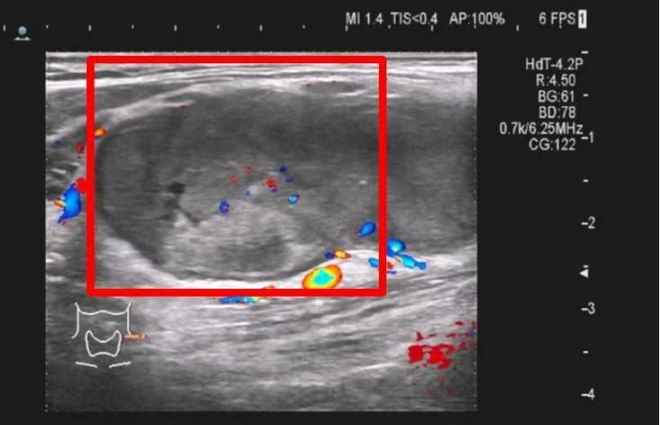 甲状腺超声检查图像:左叶多个结节,大者4.6×3.7×3.6cm,部分结节融合状。