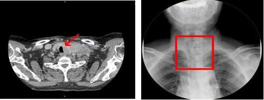 颈部增强CT图像:气管受压右移;食管X线造影图像:食管受压右移,管腔狭窄