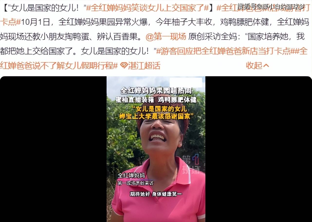 近期,全红婵妈妈的果园异常火爆,很多游客来进行打卡,第一现场也去采访了全红婵的妈妈,全妈说道:全红婵能读大学要感谢国家,国家培养她,我们就把她上交给国家了,女儿是国家的女儿。